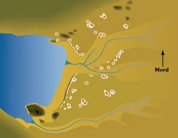 Kort over dalen ved Sermermiut med ruiner indtegnet. Ruinerne er for det meste vinterhuse fra Thulekulturen. Illustration: Henrik Klinge Pedersen efter Tina Møbjerg, 1883