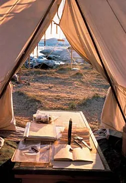 Udgravningens arbejdstelt, hvor oldsagerne registreres og tegnes i gravebogen. Foto: Jørgen Meldgaard