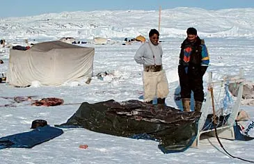 To fiskere på havisen i fjorden. På hundeslæden ligger der nogle hellefisk. Foto: Dieter Zillmann/Elke Meissner