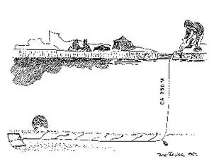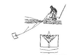 Hellefisk er blevet fisket fra isen i Kangia ved hjælp af langliner i århundreder. Tegningen viser princippet bag teknikken, som den praktiseres ved Ilulissat. Bemærk især glideren. (Tegning: Jens Rosing)