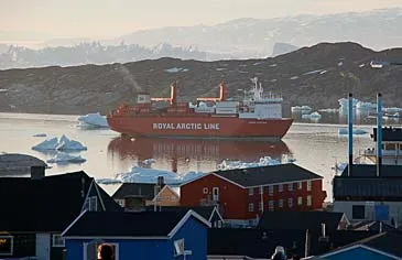 Containerskib med nye forsyninger på vej ind til Ilulissat havn. Foto: Walter Rayher